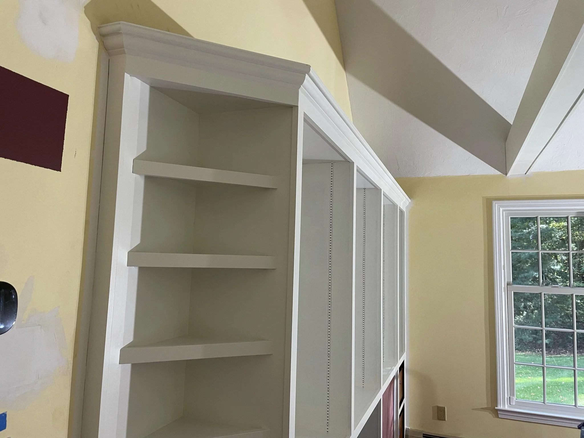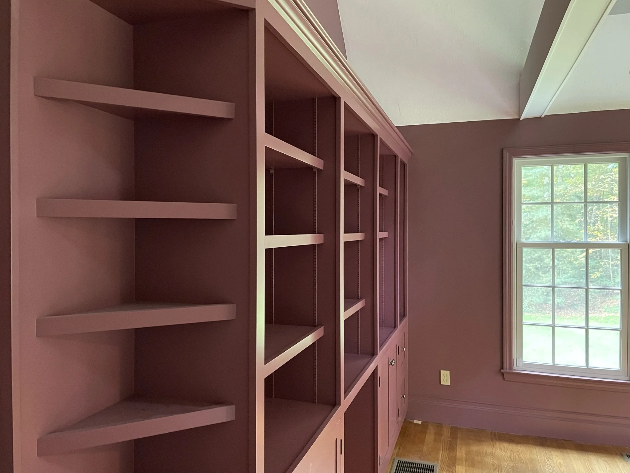Built-in shelving refinished with lacquer spray. Smooth, flawless, and perfectly even.