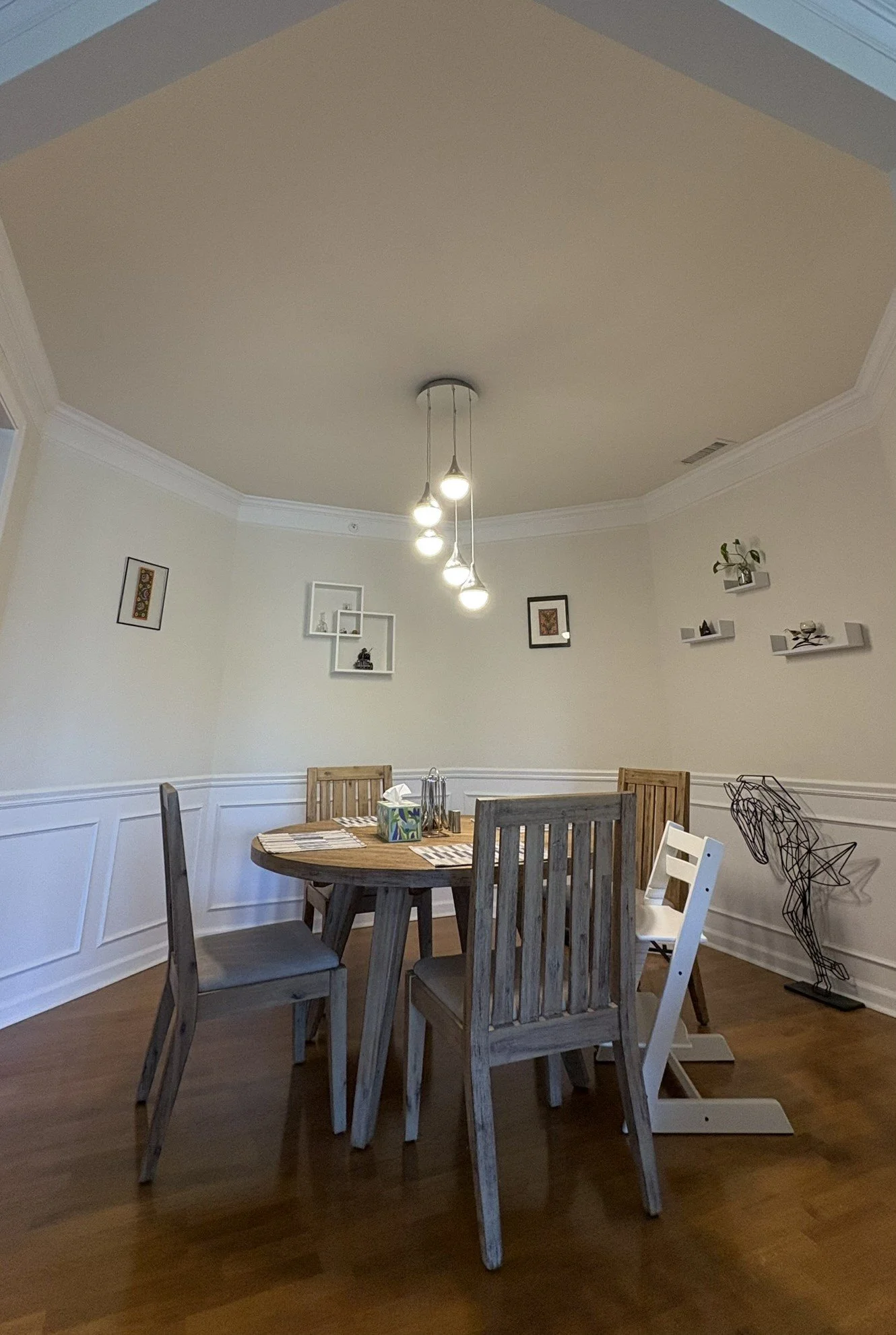Dining space upgrade with clean white wainscoting and smooth wall finishes.