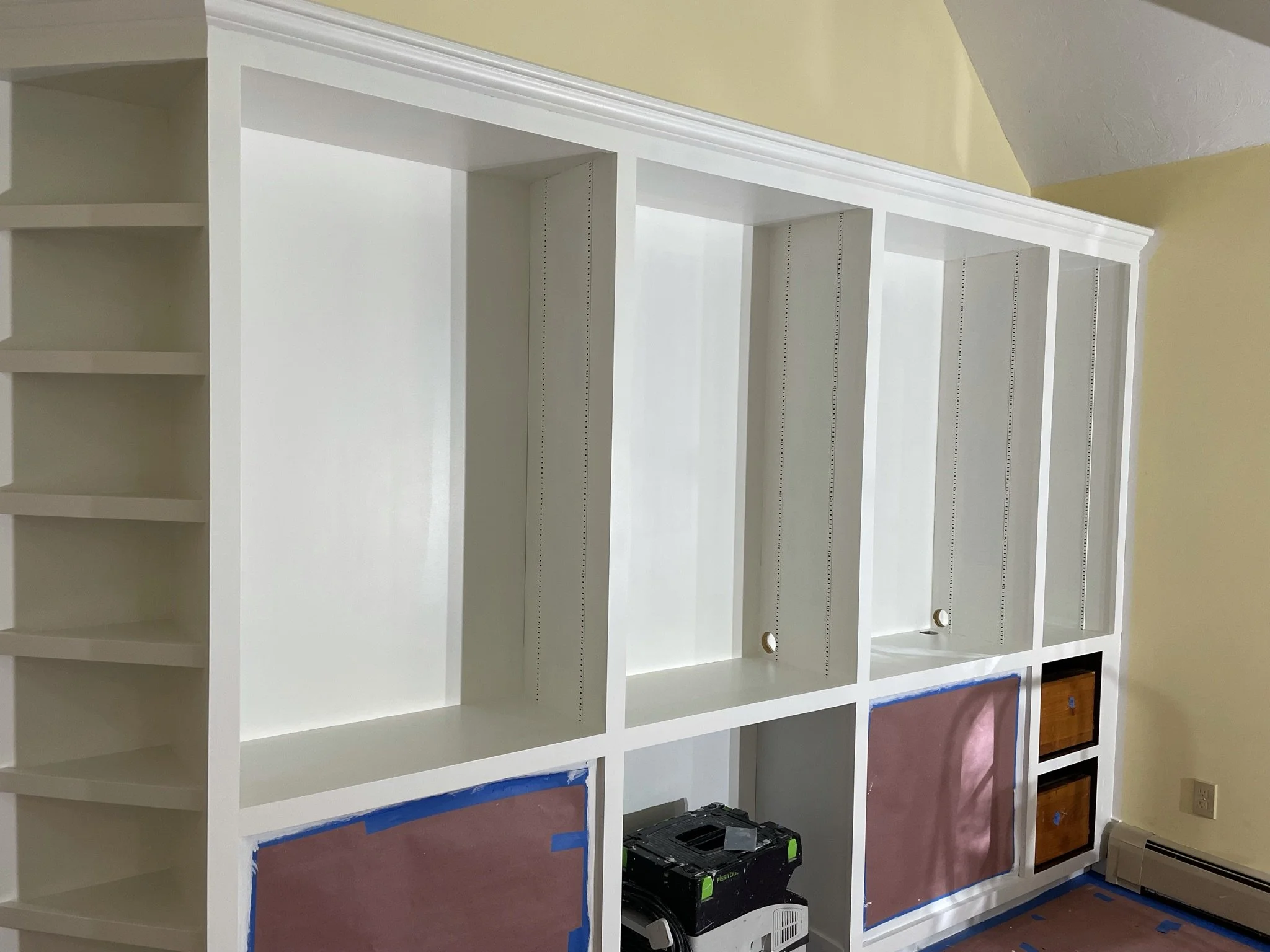 Built-in shelving refinished with lacquer spray. Smooth, flawless, and perfectly even.